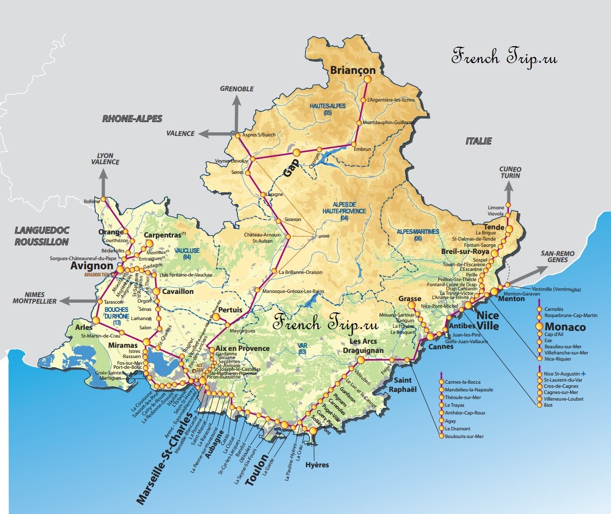 Если вы собираетесь поездить по самым популярным городкам Лазурного берега, то быстрее всего это сделать на региональных поездах — TER. Это относительно недорого, быстро и комфортно. Региональные поезда TER не нуждаются в бронировании места, в отличие от скоростных TGV. Билеты можно купить в кассах, билетных автоматах или на сайте французских железных дорог: voyages-sncf.com. Перед посадкой билет должен быть прокомпостирован!